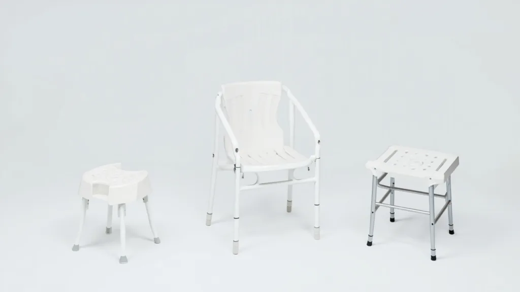 Drei oder vier Beine, eine flache Sitzfläche, meist höhenverstellbar. Die günstigste und kompakteste Variante — ideal für kleine Duschen.