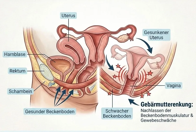 Bei einer Gebärmuttersenkung (Uterusprolaps) rutscht die Gebärmutter aus ihrer normalen Position im Becken nach unten. Dies geschieht, wenn die Beckenbodenmuskulatur und die Bänder, die die Gebärmutter halten, geschwächt sind. Stellen Sie sich vor, die Gebärmutter ist wie ein Haus, das auf einem Fundament (dem Beckenboden) steht. Wenn dieses Fundament instabil wird, kann das Organ absinken.