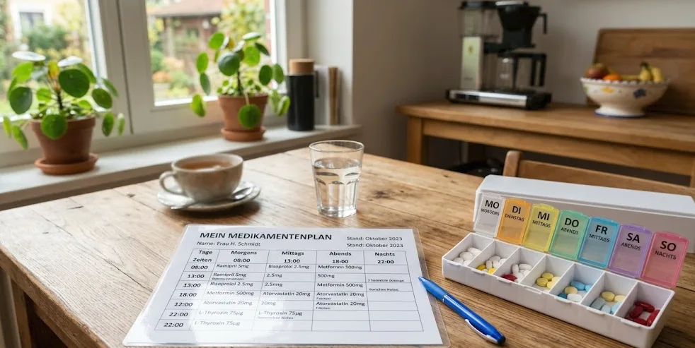 Ein aktueller, schriftlicher Medikationsplan ist das Fundament jeder sicheren Medikamentenverwaltung. Seit 2016 haben gesetzlich Versicherte, die drei oder mehr verordnete Medikamente dauerhaft einnehmen, einen Rechtsanspruch auf einen bundeseinheitlichen Medikationsplan.