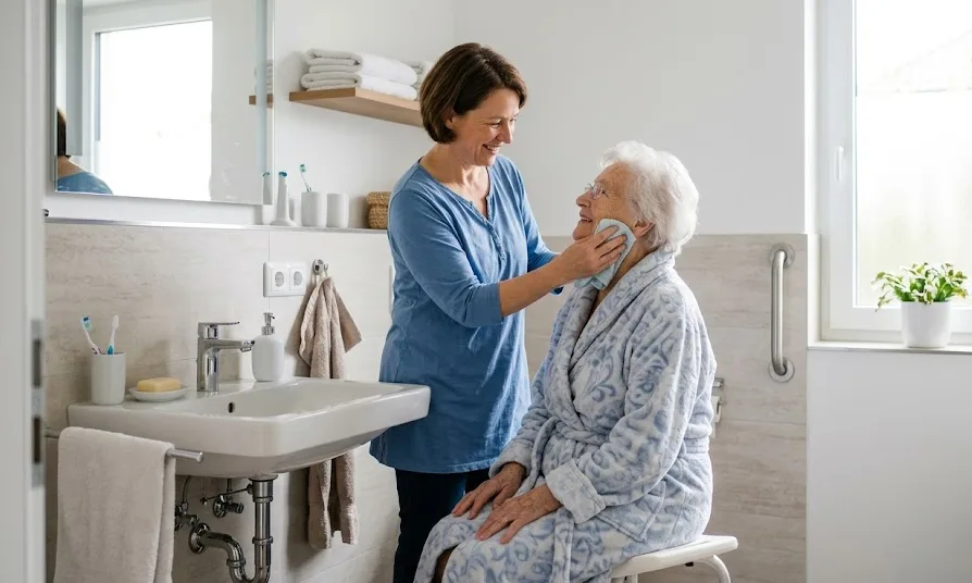 Einweg-Schürzen schützen die Kleidung bei der Körperpflege und beim Wechseln von Inkontinenzprodukten. Mundschutz (medizinisch oder FFP2) ergänzt den Infektionsschutz.