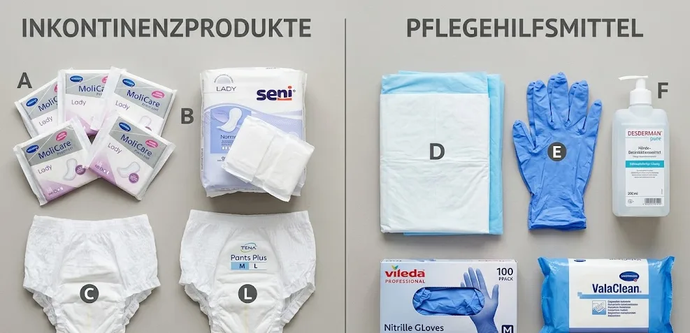 Tipp: Bei Harninkontinenz benötigen Sie in der Regel beides — aufsaugende Inkontinenzprodukte (Rezept vom Arzt) und Pflegehilfsmittel zum Verbrauch (Pflegebox über die Pflegekasse). Lesen Sie dazu unseren Überblick zu aufsaugenden Inkontinenzprodukten.