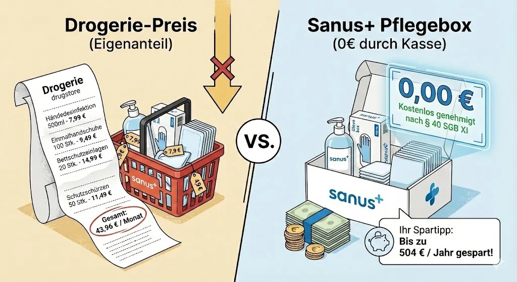 | Kriterium | Kauf in Drogerie / Apotheke | Sanus-Plus Pflegebox |